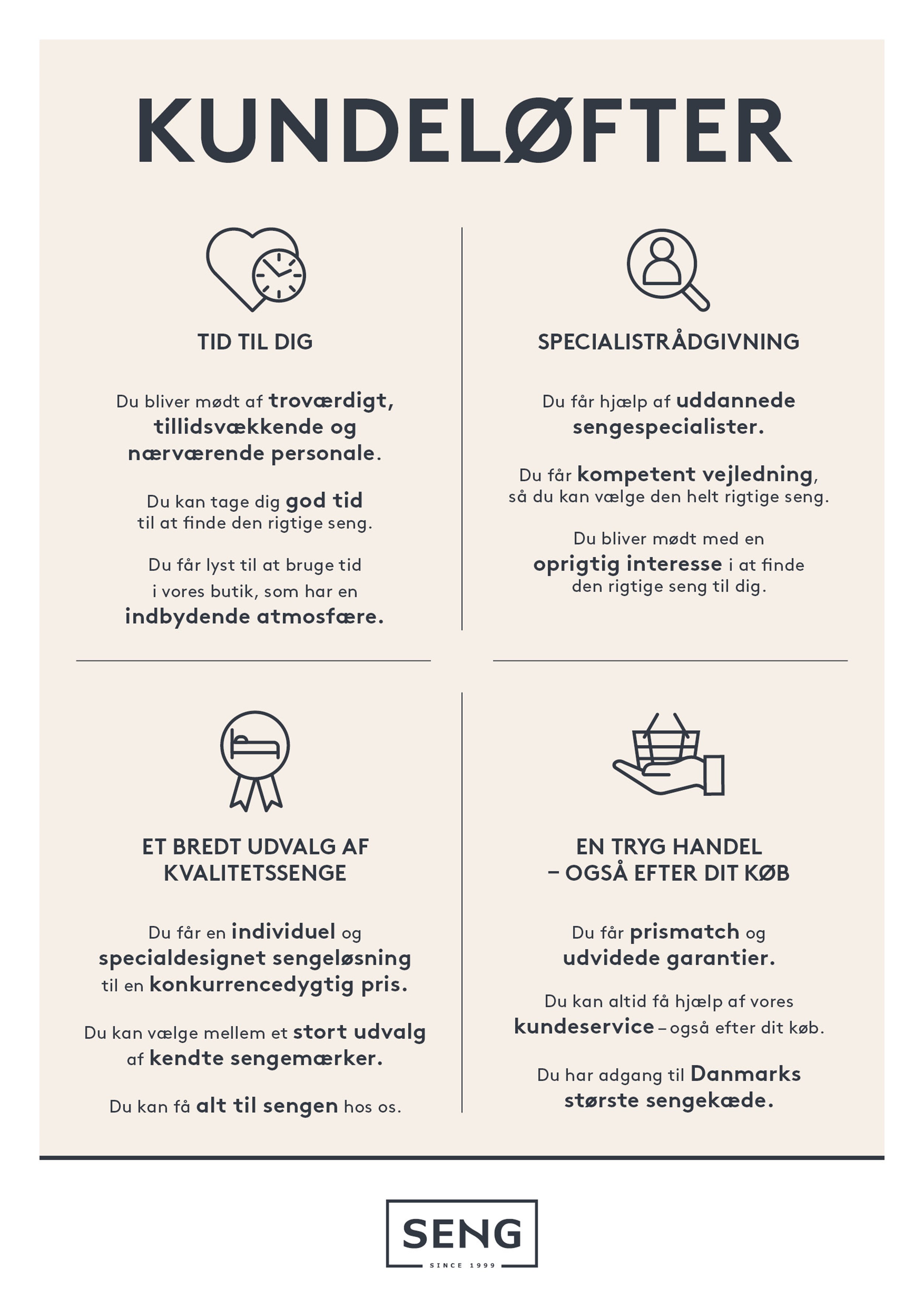 Hos SENG vil vi gerne gøre det nemt og trygt for dig at finde den helt rigtige seng. Vores kundeløfter er vores måde at vise, at du kan regne med os – både når du har brug for god rådgivning, og når du skal sove godt mange år frem.